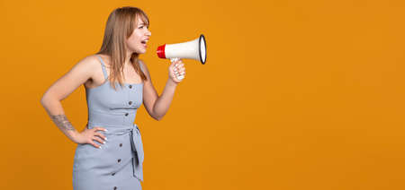 Young business woman is shouting through a megaphone on white isolated background.