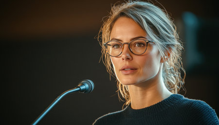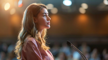 Public Speaking Event Featuring a Confident Female Speaker Presenting in Front of a Microphone With Two Blurred Audience Members in the Background Generative AI