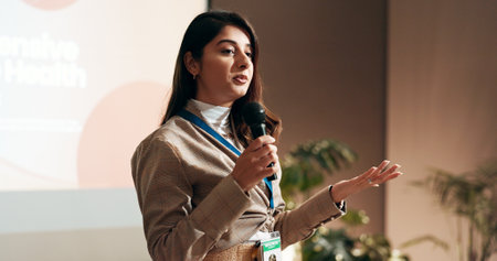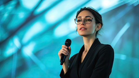 Female professional on stage holding a microphone while giving a keynote address at a corporate conference, with a modern backdrop design.