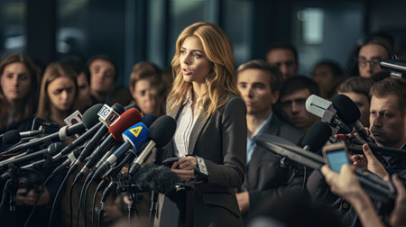 Journalists at news conference holding microphones making media interview with female politician or business woman