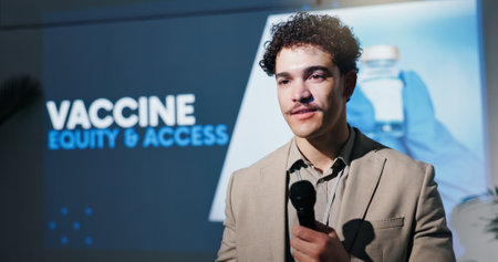 Business, healthcare and speech with man in auditorium for presentation on access and equity. Seminar, symposium and vaccine with guest speaker on stage for medical development or innovation