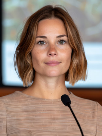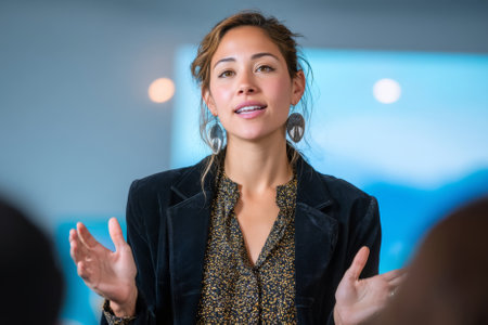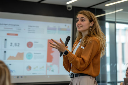 A young woman stands in front of a screen, speaking confidently to an audience during a presentation at a conference or meeting. Her gestures emphasize key points, capturing the attention of listeners.