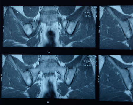 X-ray of the pelvic bones of a man. A doctor radiologist is studying an x-ray examination. A hip joint is placed on the patient’s body
