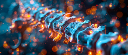 Spine structure illuminated with vibrant colors, showcasing a futuristic concept Background features blurred bokeh with a mix of blue and purple hues, enhancing depth