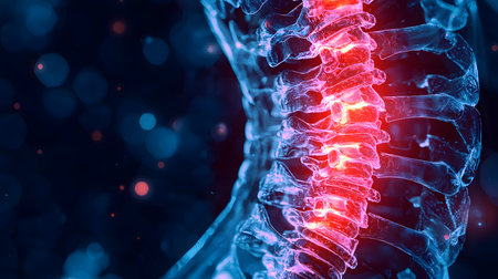 Vivid representation of acute pain in a spinal structure with highlighted red areas indicating fibromyalgia.