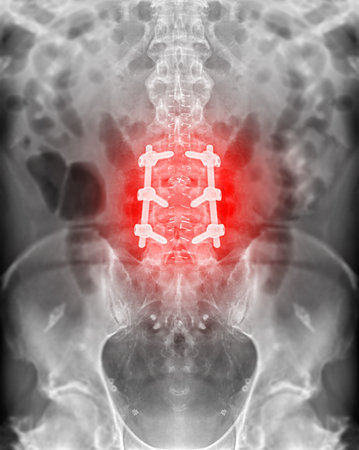 X-ray image of Lumbar spine showing pedicle screw fixation and decompression surgery in patient with spinal canal stenosis.