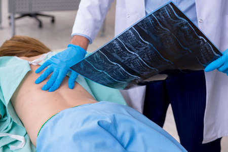 An orthopedic doctor examines a patient using an x-ray for a fracture of the back ribs. Concept of bruised and damaged ribs on the back, background, traumatology