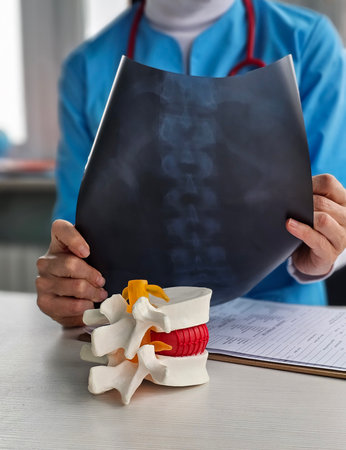 Doctor examining spine X-ray while holding a model of vertebral anatomy in a clinical setting