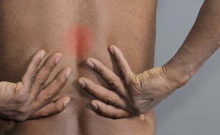Unhappy young man in gray t-shirt suffering from severe back pain Touch your back to try to ease the pain in your spine. close up pictures