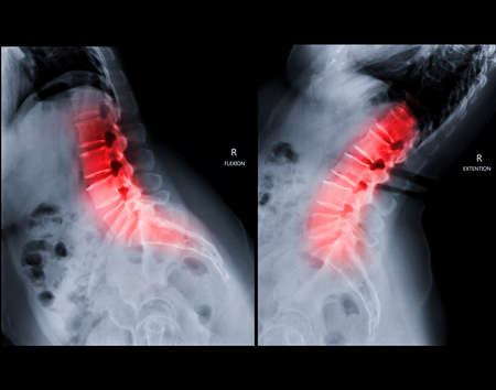 X-ray image of lumbar Spine lateral Flexion and Extension view showing lower back pain.