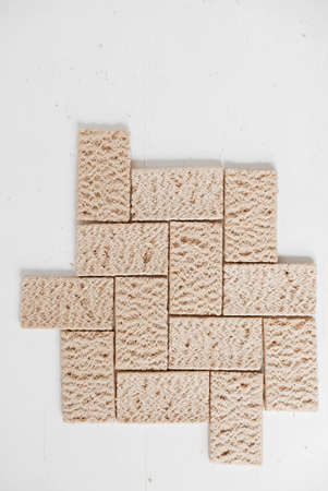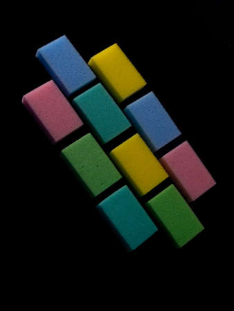 colored sponges for washing dishes from foam on a black background laid out in the style of brickwork.