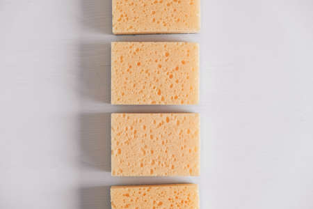 Yellow porous sponges on a white background. Top view. Copy, empty space for text.