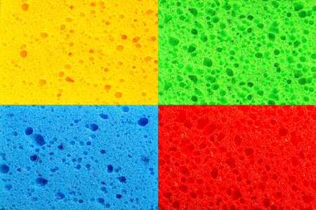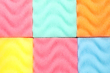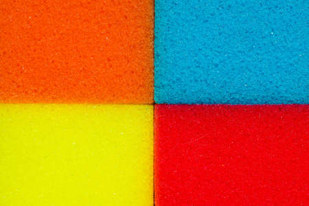 Cleaning kitchen sponge texture as background. Colorful yellow pink green purple blue multicolor sponges. Close up macro about sponges. Sponge pattern textures concept background or wallpaper