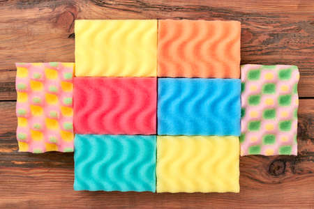 Colorful objects for washing dishes. Group of multicolored kitchen sponges on wooden background.