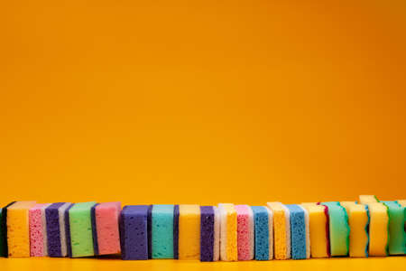 Many multicolored sponge for washing dishes on a yellow background. space for text