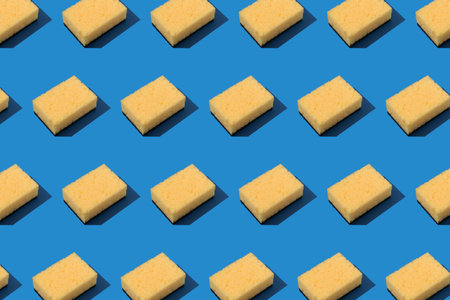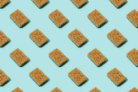 Pattern with yellow dishcloth on blue background. Household products and cleaning concept, selective focus