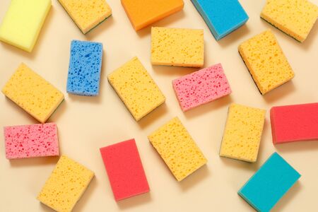 Sponges of different colors on a beige background. Top view. Washing and cleaning set.