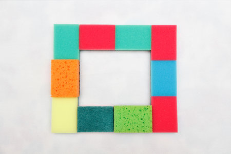 colorful square sponge foam pieces neatly arranged in a square shape. absorbent and soft textured material. washing sponge
