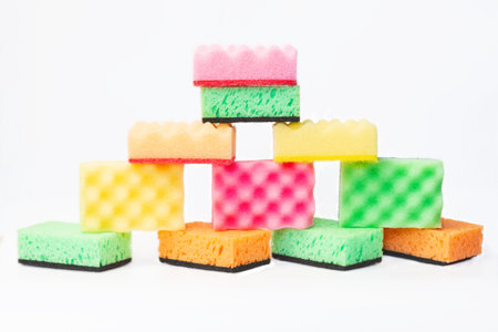 Colored sponges for washing dishes and cleaning with foam on a light background. The concept of cleanliness in the house, protection from germs and viruses, selective focus
