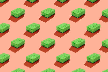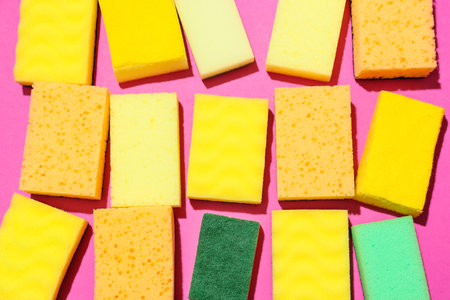 Kitchen sponges for washing dishes and other domestic needs on pink background