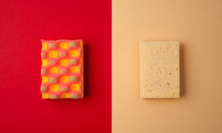 Eco friendly sponge vs foam rubber. Zero waste concept. Top view on red and biege background. Household cleaning sponges for dishwashing, kitchen, bathroom. Recycling concept.