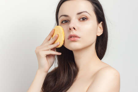 pretty brunette naked shoulders sponge in hand cosmetics