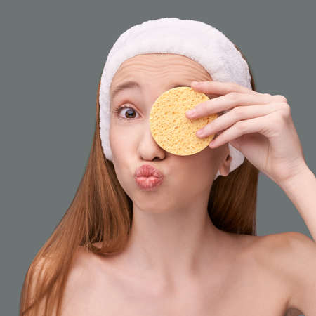 Young beauty girl remove mascara. Face sponge cleaner. Ecology nature facial product. Bathroom home routine. Evering tonic hygiene. Skincare healthy procedure. Washing make up