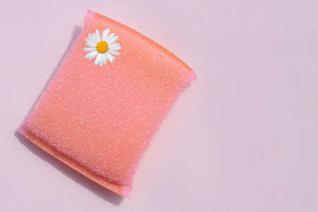 Pink porous sponge for bath on pink background with shadows. Spa, shower cleaning accessory
