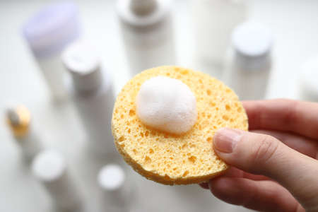 Yellow sponge with foam for the face in a female hand against the background of bottles of cosmetics