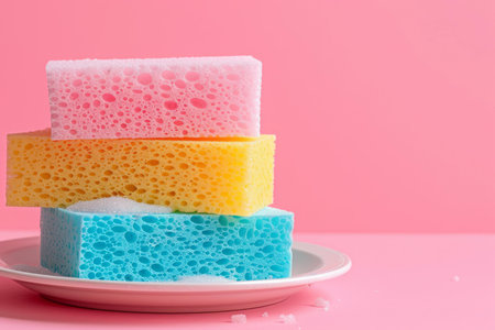 Stack of bright cleaning sponges on a dish, with a minimalist pink backdrop
