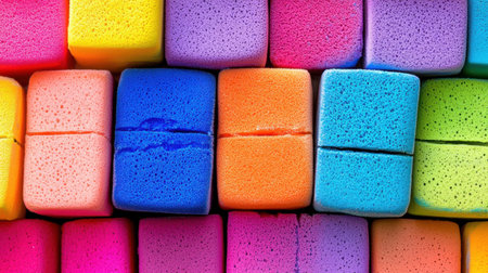 This image showcases a series of bright and vibrant sponges arranged neatly in a colorful pattern, ideal for cleaning or crafting purposes.