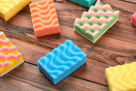 Set of multicolored kitchen cleaning sponges. Group of different colors cleaning sponges on brown wooden background, top view.