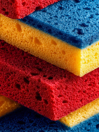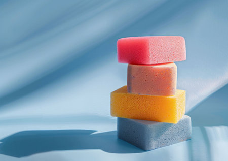Colorful sponges stacked on a soft blue background, showcasing a vibrant arrangement This image captures both simplicity and cleanliness, ideal for cleaning or hygiene themes
