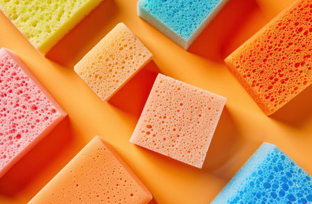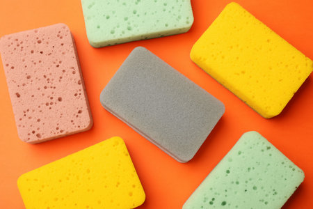 Colorful sponges on a bright orange background, showcasing a variety of shapes and sizes, ideal for cleaning and household use, vibrant and eye catching