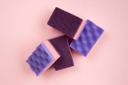 Kitchen sponges for washing dishes and other domestic needs on pink background