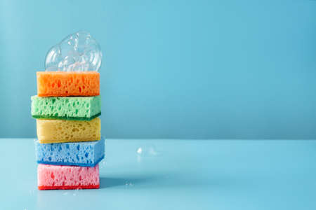 A stack of cleaning sponges on a blue background. The concept of cleaning, cleansing and bleaching.