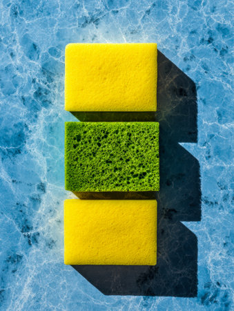 Vibrant yellow and green rectangular sponges stand in a vertical line on a rugged blue background, with bold shadows emphasizing their lively hues and clean design.