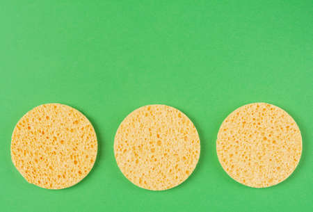 Three round yellow facial sponges on a green background. skincare accessories. Flat lay, copy space