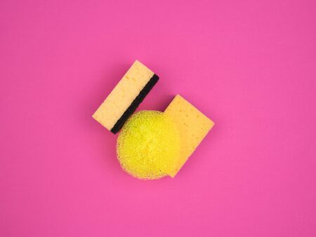 Set of new yellow and gray sponges for dishwashing on pink background. Domestic household and cleaning concept. Close up, copy space