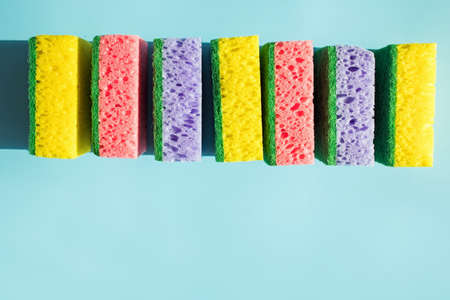 Colorful sponges for washing dishes isolated on blue background.