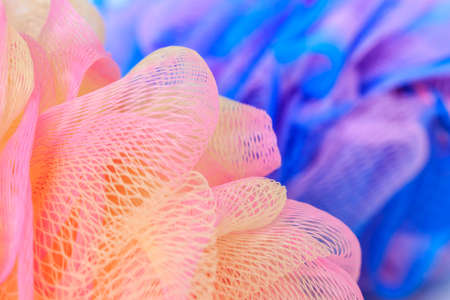 Sponges - close-up. Household cleaning concept. Colorful orange pink yellow sponges on pink background, soft focus, copy text.