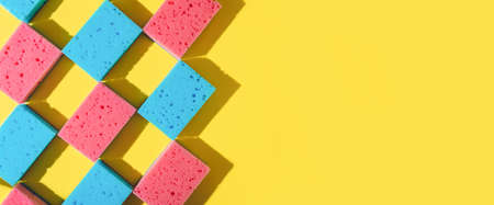 House cleaning sponges on yellow background, copy space. Flat lay or top view. Cleaning service or housekeeping concept with space. Hard shadows in sunlight. Long horizontal banner