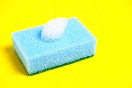 Yellow dishwashing sponges, cleaners, detergents, household cleaning sponge for cleaning, household cleaning sponge, Kuchenschwamm, Copy space
