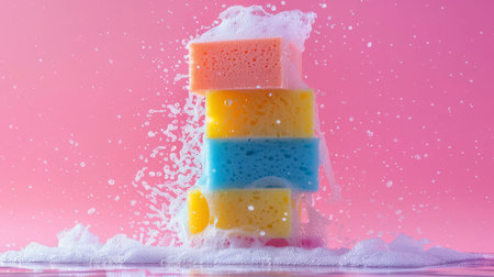 Colorful Sponges Stacked High, Drizzled with Soap Suds on a Luminous Background