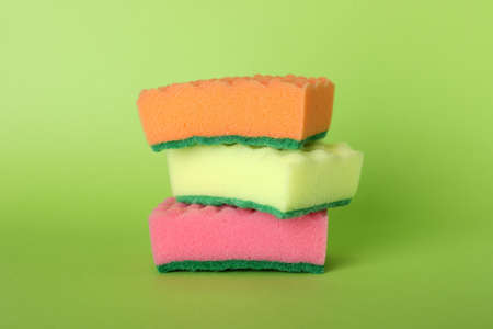 Sponges for dishwashing. Kitchen equipment. Green background. Studio