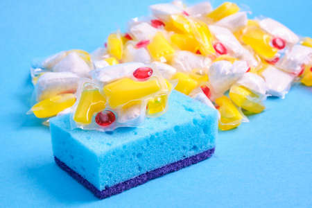 gel capsules for dishwashers and sponges on a green and yellow background of the places of the copy top view, the choice between washing dishes with your hands or in the dishwasher