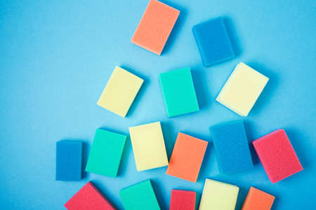 Multicolored sponges for washing dishes and other household needs. The sponges lie on a blue background at a slight angle. Cleaning and Dishwashing Concept