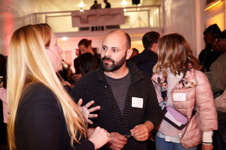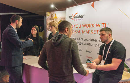 KIYV, UKRAINE - MARCH 14, 2019: People visit Go Beyond Payoneer Forum in Khreschatyk Hotel. Payoneer is a financial services company that provides online money transfer and digital payment services.