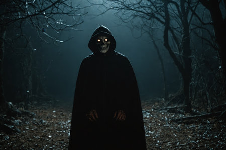 Eerie night scene featuring a hooded individual, adding a sense of suspense and intrigue.