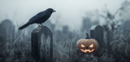 A dark, fog-covered graveyard features eerie gravestones, glowing jack-o-lanterns, and a crow perched nearby, with a full moon illuminating the scene, creating a haunting Halloween atmosphere.